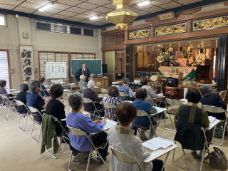 | 何ともあろうことか写真を撮り忘れて しまいました(涙) 当日ご参加下さった方々、ご門徒さん 楽しみにして頂いてる方々 今、このHPをご覧頂いている方・・・ ごめんなさい 14時より 本堂にて基本講座を行いました。 初めての開催で緊張や不安でいっぱいでしたが 多くの方々にご参加頂きまして大変うれしく 思っています。 どうも有難うございました! 講座開催の趣旨説明から始まり お寺に来られた際 境内地に入る際、出る際の作法 本堂に入る際、出る際の作法 ご自宅や本堂でのお参りの仕方 お経をお勤めするお参りや お経をお勤めしない時のお参りの仕方 ふさわしくない言葉 ふさわしい言葉、本堂内の名称 等々・・・。 この様なご質問を頂きました いくつかご紹介しますね! ・お線香は何本お供えしたらいいのですか? ・仏さまへのお供え物はどんな気持ちで お供えしたらよいのですか? ・お仏飯はいくつお供えするの?等々です。 講座終了後には1F広間にて 茶話会を行いました。 この度のスイーツはロールケーキ (堂島ロール)と京都のお漬物 (白菜・大根・しば漬け)でした。 皆さまとで和気あいあいと楽しい時間を 過ごす事が出来ました! この基本講座・茶話会を通して 少しづつでも皆さまの心のモヤモヤが はれて、法事や日々のお参りのお役に立てれば 法要でのお聴聞のお役に立てれば、又、茶話会を 通して人と人とのつながりのパイプが 太くなって頂けたらなあ・・・ と思っています。 称名 |