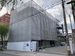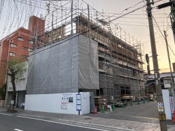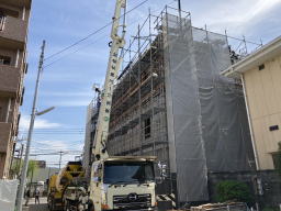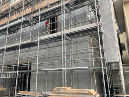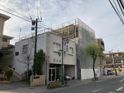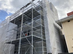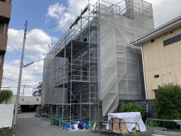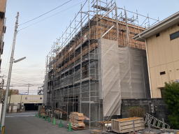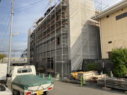 2021年3月9日撮影(駐車場より) 足場、木の板も3階部分まで伸びています。 1階と2階の壁面コンクリートが見えます。 |