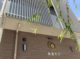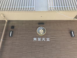 2021年5月29日撮影 浄土真宗の下り藤と会館名称”無量光堂” |