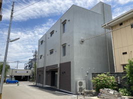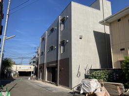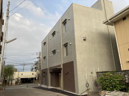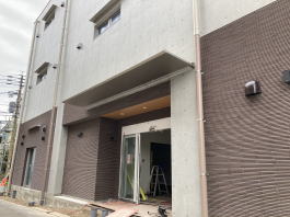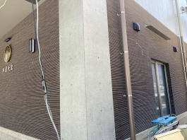 2021年5月29日撮影 建物の右側です。駐車場側です。右下に玄関 が見られます。足場があった為、玄関の屋根は まだですね! |