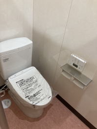 2021年6月14日撮影 エントランスにカーペットが貼られました。 写真左手前:洗い場 その奥:多目的トイレ その奥:内階段 写真中央:エレベーター 写真右奥:男性、女性トイレ |